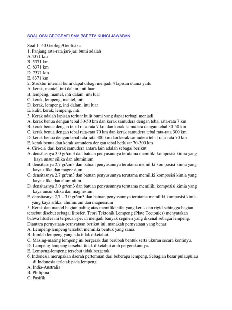 Kumpulan Soal Olimpiade Geografi Sma Tingkat Kabupaten 2013 2015 Edu Campus from 1.bp.blogspot.com Kumpulan soal dan solusi osk geografi; Kumpulan soal united states geography championships; Kumpulan soal olimpiade sains nasional. Olimpiade sains nasional atau biasa disingkat osn adalah event kompetisi sains tahunan untuk siswa siswi pada jenjang sd, smp, dan sma yang diselenggarakan oleh pusat prestasi nasional. Nah, sekarang geovolcan akan membantu kamu mempersiapkan diri dengan memberikan latihan beserta pembahasan soal. Kumpulan soal dan solusi osn geografi; Pesertanya diseleksi dari tingkat kota sampai tingkat nasional untuk dipilih menjadi tim yang nantinya akan mewakili indonesia di tingkat internasional. Osn geografi sma tahun 2019 seleksi olimpiade sains nasional osn jenjang sekolah menengah atas sma tahun 2019 telah diselenggarakan dan telah diperoleh juara.