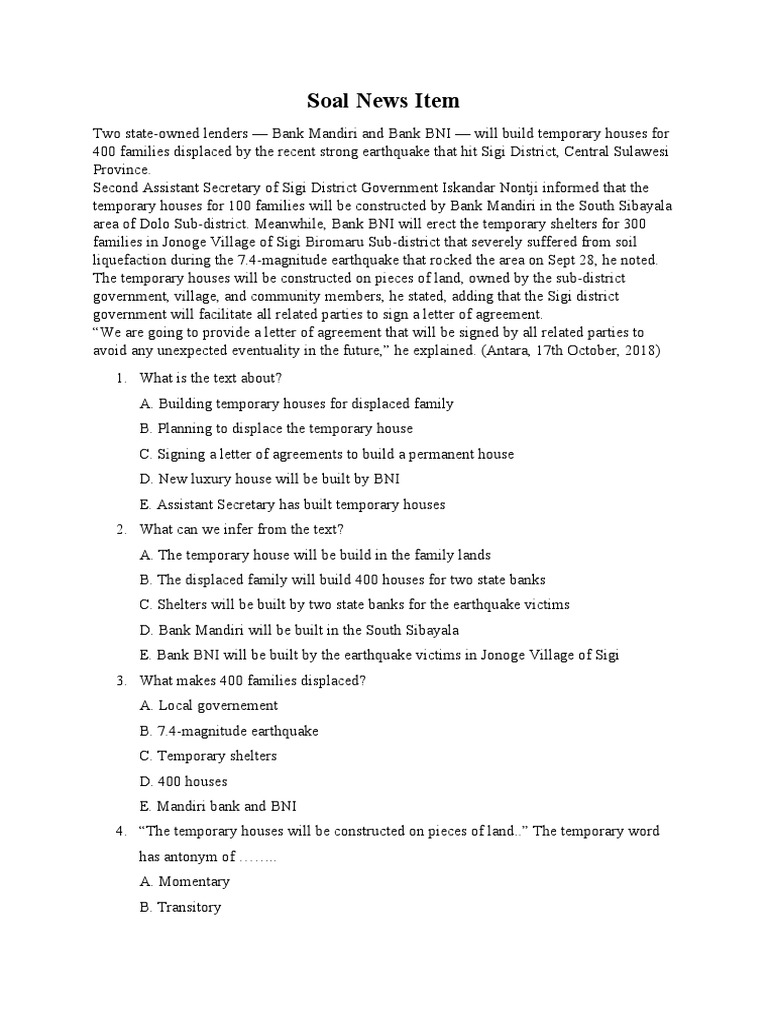 50 Contoh Soal Bahasa Inggris Pilihan Ganda Dan Essay Untuk Siswa Smp from www.text.co.id The events are considered newsworthy or important. Pc.soal pilihan ganda dan essay protocol routing merupakan protokol yang mengumumkan kepada autonomous system yang lain tentang jaringan yang berada dibawahnya maka jika sebuah autonomous system ingin berhubungan dengan jaringan yang ada dibawahnya maka mereka harus. In anthropology in anthropology in anthropology in anthropology in anthropology in anthropology in dakzmh islam dan tempat lahir 38. News item text bahasa inggris itu salah satu jenis teks dijadikan materi utama selain teks analytical exposition, recount, report, descriptive, dan explanati. Demokrasi bisa diisyarati dengan kesamarataan untuk seluruh pihak. Soal un tentang news item. The mindset of personal responsibility essay. News item is a text which informs readers about events of the day.